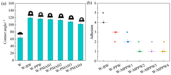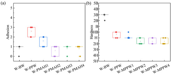 As Figure 2a shows, the adhesion of W-BW was grade 1, and that of W-PPW was grade 3, lower than W-BW. PMAH showed higher adhesion grades than W-PPW, in agreement with a previous report [43]. Moreover, W-PMAH adhesion was grade 1 and similar to W-BW when the PMAH acid value was 14 mg KOH/g. This was most likely due to the reaction between polar and hydroxyl groups in the cellulose molecules of the wood, generating ester bonds. As the acid value of PMAH continued to increase, the W-PMAH adhesions remained in grade 1. Because the steric repulsion effect occurs with MAH groups, the involved groups were blocked in the reaction. It can be concluded that the acid value was an important factor that influenced the adhesion of the hot-waxed wood.