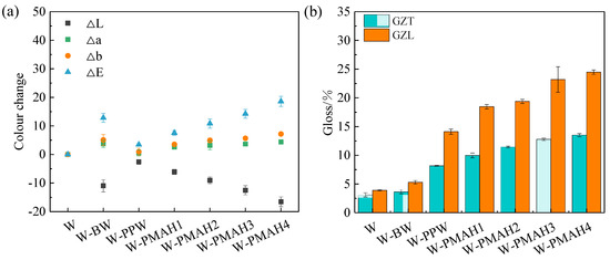 Decorative performance is also important for hot-waxed wood, including color and gloss in Figure 4. As shown in Figure 4a, variations of color in untreated and hot-waxed wood surfaces were measured. Compared with the untreated wood, there were apparent changes in the hot-waxed wood surface, as indicated by the reduced L* value and the increased a* and b* values. The Δa values and Δb values increased, and ΔL decreased from W-PPW to W-PMAH4. The color of the W-PPW surface was close to uncoated primary wood due to the slight color changes with the lowest ΔE. The color values of W-PMAH2 and W-PMAH3 were like W-BW, which tended to be low-brightness red and yellow.