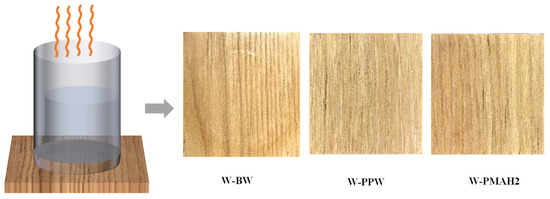 To remove burrs, wood surfaces were polished along the grain using sandpapers with 180, 240, and 320 grit in turn. Waxes were melted and then coated on the wood surface through a heater at, respectively, 100 °C for BW and 180 °C for PPW and PMAH, with a certain fluidity keeping 5~10 min. The wood surface was wiped at a constant speed with a clean white cloth to apply the wax evenly on the surface of the wood. The samples were cooled naturally. Finally, BW, PPW, and PMAH hot-waxed woods were achieved and were called W-BW, W-PPW, and W-PMAH, respectively. From this analogy, W-PMAH1, W-PMAH2, W-PMAH3, and W-PMAH4 were obtained.