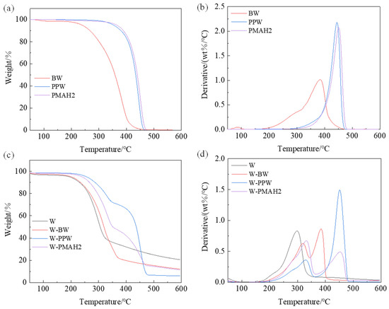 In Figure 6, the TG and TGA curves of the waxes and hot-waxed wood were investigated to represent their thermal stability. Figure 6a shows the lower initial thermal degradation temperature (T5%) at 239.67 °C for beeswax. The maximum peak temperature of beeswax (383.4 °C) is lower than that of PPW (444.6 °C) in Figure 6b. Compared with PPW, that of PMAH2 (451.2 °C) is slightly increased. To explain the thermal stability of the samples, the TG and DTG curves of untreated wood and hot-waxed wood are reported in Figure 6c,d. In Figure 6c, untreated wood’s initial thermal degradation temperature (T5%) was 195.69 °C, which is lower than hot-waxed wood. In Figure 6d, only one peak (285.6 °C) in untreated wood is visualized, representing the degradation of the wood. There were two peaks in hot-waxed woods; the first peak mostly represented wood degradation, and the second peak represented degradation of the waxes. Hot-waxed woods improved the temperature of the degradation of wood [18], and the improvement may be beneficial for thermal degradation in application. Indeed, it was evident that the second peak of W-PPW (451.9 °C) and PMAH2 (453.1 °C) were higher than W-BW (384.71 °C). The reason was that the waxes formed a protective layer for the wood, which slowed down the heat transfer in the wood to protect the wood, thus reducing the degradation rate of the wood. It can be concluded that hot waxing increases the initial thermal degradation temperature and the maximum exothermic temperature of the wood, and the thermal stability of W-PMAH2 is higher than W-PPW.