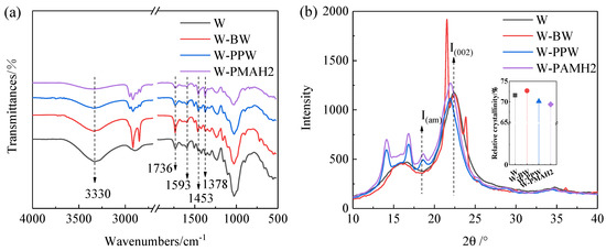 FTIR spectra of uncoated and hot-waxed woods are presented in Figure 7a. The peak at 3330 cm−1 reflects the stretching vibration of hydroxyl groups in wood, and W-BW was close to untreated wood. However, the vibration band of hydroxyl groups for W-PPW was broadened and weakened. The FTIR spectra of W-PMAH2 were weakened compared to W-PPW due to the decreased number of hydroxyl groups during hot waxing. The W-PMAH2 1736 cm−1 band was broadened and sharpened, and the band at 1593 cm−1 relatively decreased. Moreover, the peak at 1716 cm−1 was not observed in W-PMAH2 in Figure 1b and Figure 7a. That can be attributed to the change in MAH groups. The reason is that MAH hydrolyzed to carboxylic acid, and the C=O vibrations band for the cyclic anhydride ring decreased. At the same time, this may be due to a partial cross-linking reaction and esterification between carboxyl groups in the PMAH during hot waxing [34,44]. Therefore, the vibration peak of the ester base was more prominent and broadened in W-PMAH2. The bands at 1453 cm−1 and 1378cm−1 were vibration peaks of the carbon skeleton of the wood. Both bands were sharper in W-PMAH2 than in W-BW and W-PPW. It was concluded that the combination of PMAH2 and wood was useful. The FTIR spectra revealed that a weak chemical reaction may occur between MAH groups and the wood and be related to the adhesion of PMAH2. The result is consistent with the great adhesions of W-MAH after soaking in water for 24 h in Figure 3b.