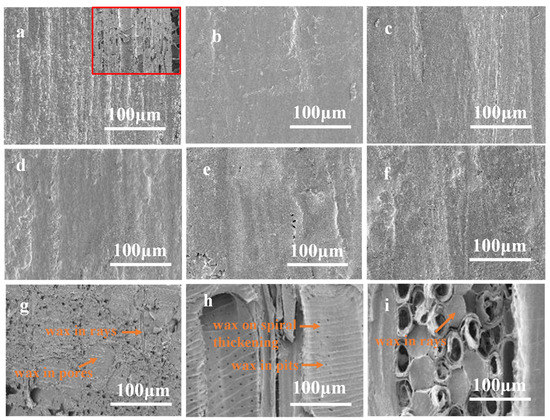 The SEM of the surface and inner structure of hot-waxed woods: (a) The surface morphology of untreated wood and W-BW; (b) The surface morphology of W-PPW; (c) The surface morphology of W-PMAH1; (d) The surface morphology of W-PMAH2; (e) The surface morphology of W-PMAH3; (f) The surface morphology of W-PMAH4; (g) The cross-section of the hot-waxed wood; (h) The radial section of the hot-waxed wood; (i) The tangential section of the hot-waxed wood.