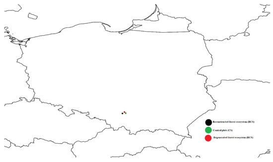 The research was carried out on permanent research plots occurring in areas of large-scale disturbances such as fires (PF) and reclaimed post-mining areas (PM). The plots were located in solid single-species stands: birch stands, pine stands, and larch stands. The control plots were located on Podzolic soils in the managed forests of the Olkusz Forest District (CS) (Figure 1).