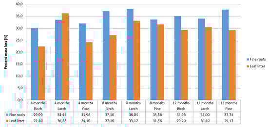 The rate of decomposition of leaf litter and fine roots depends on many biotic and abiotic factors []. In our research, the rate of decomposition of fine roots and leaf litter from birch, larch, and pine did not differ. The greatest loss of mass of fine roots and leaf litter occurred in the first four months of decomposition (March to June). The mass loss of fine roots was approximately 31% after 4 months of decomposition, and 34% after 12 months of decomposition. Leaf litter mass loss was 27% after 4 months of decomposition, and 30% after 12 months (Figure 2).