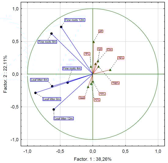 Statistical analysis was performed using Statistica 13.3 software (StatSoft, Inc., Tulsa, OK, USA, 2017). Two-way ANOVA was carried out, followed by the Tukey RIR test (at p < 0.05). The analysis included determination of the differences in the nutrient pool supplied to the soil by fine roots and leaves (C, N, P). Before starting the statistical analyses, the data were checked for normal distribution using the Shapiro–Wilk test followed by logarithmic transformation. Moreover, the data were tested for homogeneity of variance using the Brown–Forsythe test. Principal components analysis was performed in order to determine the factors influencing the distribution of the biomass of fine roots and leaf litter. The analyzed soil properties were pH, grain size composition, and content of C, N, Mg, K, and P.