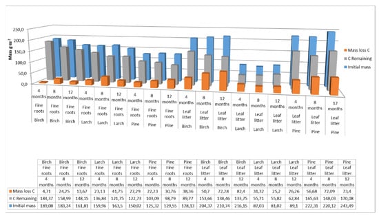 The carbon pool supplied to the soil by the fine roots was 177 g m−2 for birch, 144 g m−2 for larch, and 127 g m−2 for pine. The initial biomass of the fine roots was 556 g m−2 for birch, 437 g m−2 for larch, and 340 g m−2 for pine. After a year of decomposition, the amount of carbon remaining in the fine roots was 148 g m−2 for birch, 122 g m−2 for larch, and 89 g m−2 for pine. For leaf litter, the carbon pool supplied to the soil was 210 g m−2 for birch, 86 g m−2 for larch, and 228 g m−2 for pine. The initial biomass of the litter was 470 g m−2 for pine, 192 g m−2 for larch, and 445 for birch g m−2. After one year of decomposition, the amount of carbon remaining in the leaf litter was 133 g m−2 for birch, 62 g m−2 for larch, and 170 g m−2 for pine. Over this one-year decomposition period, the fine roots of birch and larch therefore released less carbon than leaf litter. Carbon mass-loss rates were 16% for fine birch roots and 15% for larch roots, while for leaf litter the rates were 36% for birch and 27% for larch. Carbon mass-loss rates for leaf litter and fine pine roots were comparable, at around 25% (Figure 4).