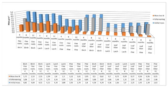 The nitrogen pools supplied to soils by fine roots and leaf litter were comparable, amounting to approximately 4 g m−2 for birch, 3 g m−2 for larch, and 2.5 g m−2 for pine. However, larch, pine, and birch fine roots released more nitrogen than leaf litter over the course of the year. Nitrogen mass-loss rates from the decomposition of fine roots were 48% for birch and 60% for larch and pine over the one-year study period. For the decomposition of leaf litter, nitrogen mass-loss rates for soils were 14% for pine and birch and 33% for larch, over the same period (Figure 5).