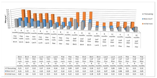 Phosphorus pool supplied to soils with fine roots and leaf litter at different decomposition times for different species. (Initial mass—the initial mass of phosphorus accumulated in fine roots or leaf litter at the end of the growing season; P Remaining—phosphorus accumulated in fine roots or leaf litter after 4, 8 or 12 months of decomposition; Mass loss C—loss of phosphorus from the fine roots or leaf litter after a specified decomposition time).