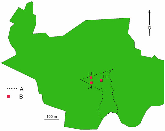 Plot J-II (52°48′28″ N 16°28′56″ E) (Figure 1) is an area mainly with oak-hornbeam forest with beech trees (Galio-sylvatici-Carpinetum stachyetosum var. with Fagus sylvatica/Caricetum acutiformis). It is located at a shallow terrain hollow, where water used to accumulate during rainy periods. The last surface flooding in this area was observed in 1982. There are also hazel bushes (Corylus L.), and earlier, there was quite dense common dogwood (Cornus sanguinea L.) and not too much grass. At present, however, in this area, there is almost no ground flora (Figure 4A).