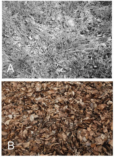 Plot J-I (52°48′28″ N 16°28′52″ E) (Figure 1) is a typical oak-hornbeam forest area (Galio-sylvatici-Carpinetumstachyetosum var. with Fagus sylvatica). In the first period of research (1981–1982), this area was adjacent to a large cut-over area. This plot was the driest area, with considerable daily and seasonal temperature fluctuations. The stand consisted mainly of old monumental beech (Fagus sylvatica L.), with a slight mixture of hornbeam (Carpinus L.) and oaks (Quercus L.). There was no undergrowth (Figure 2A). The ground flora comprised mainly grass (95%) with a slight mixture of sedge (Figure 3A). The litter contained mainly old beech leaves (75%) and oak, hornbeam and sedge leaves.