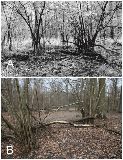 In this area, only the bushes of the hazel (Corylus avellana L.) are still present, whereas the common dogwood has been lost completely. Additionally, the sporadic tufts of the sedge (Carex) are not present now (Figure 4B).