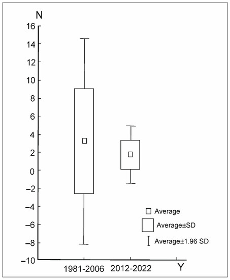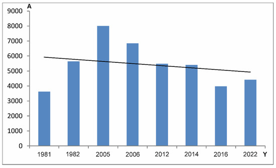 The average abundance of Uropodina in the reserve during the research periods remained at the level of 5400 specimens per m2. In general, since 2006 in Jakubowo, one can observe a decrease in the abundance of Uropodina mites. Statistically significant differences in the average number of specimens per sample in the whole community of Uropodina in research periods 1981–2006 and 2021–2022 were observed (p < 0.01 Mann–Whitney U-test = 10.805, z = 2.88) (Table 3, Figure 7). Abundances below the average were observed in the years 1981, 2016, 2022, while abundances above the average were observed in the period 2005–2006. In the other periods, the abundance of Uropodina mites remained similar to the average (Figure 8).