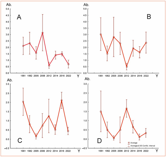Changes in abundance (Ab.) over research years (Y) of four species, which regularly occurred in examined Uropodina communities in Jakubowo: (A)—T. aegrota, (B)—O. minima, (C)—T. pauperior, (D)—U. pannonica.