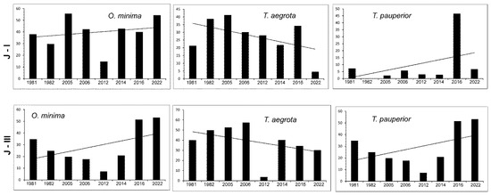 The analysis also focuses on the changes in abundance of T. aegrota, T. pauperior, O. minima and U. pannonica (Figure 9), which were the four species with regular occurrence in the examined communities.