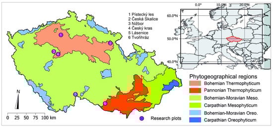 The research on the current oak decline situation in the Czech Republic was conducted during 2020/2021 and involved six oak stands (Quercus robur and Q. petraea) in various locations across the country. All the selected stands are managed forests originating from artificial regeneration. The plots were selected based on different levels of decline symptoms that included defoliation in the crown, formation of epicormic shoots, high crown transparency, and tarry exudates on the bark. Although the stands were characterized by weakened conditions and contained symptomatic trees, decline symptoms were not uniformly observed in all stands. Plot altitudes ranged from 198–530 m a.s.l. (Figure 2, Table 1). The studied plots are located in the mesophytic (Nižbor, Lásenice) and thermophytic (Pístecký les, Český kras, Tvořihráz, Česká Skalice) zones.