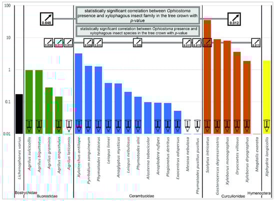 Subcortical insects reared from rearing cages. The individual species are grouped into families. The y-axis represents the logarithmic number of records of each species. Boxes with arrows represent the positive correlation between Ophiostoma presence and subcortical insects (with p-values).