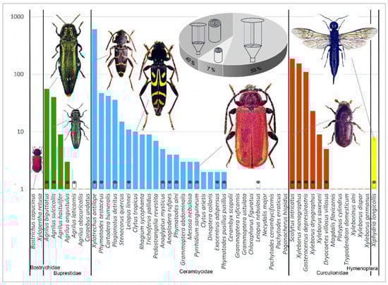 Subcortical insects captured in window traps. Individual species are grouped by family. The y-axis represents the logarithmic number of records for each species. Pie chart represents percentages for the number of species captured in each trapping method and by both methods together.