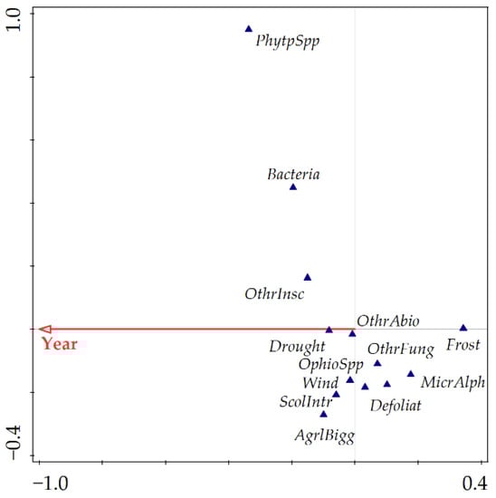 The most common chronology and important causes of oak decline were studied based on the oak decline episodes database. Multivariate statistical analysis showed that factors involved in oak decline changed over time (Figure 6). In the oldest records, usually there was a single factor, or a couple of factors occurred together (e.g., frost, drought, Microsphaera alphitoides Griffon and Maubl. + defoliators). Gradually, more factors began to be cited as acting together, some of which (usually drought) were presented as the main factor and others as secondary factors. In the 1990s, also new biotic factors appeared, such as Phytophthora or bacteria. The results showed a significant relationship between factors and the timescale of oak decline records.