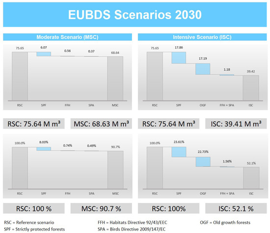 Both implementation scenarios are based on a total area of Germany of 35.803 M ha, of which 11.125 M ha is forest and 24.668 M ha is non-forest land uses [32], as seen in Table A2. The EUBDS’ objectives translate into a future protection area of at least 10.741 M ha (i.e., 30% protected areas), of which at least 3.580 M ha (i.e., 10%) shall be strictly protected, including all primary and old-growth forests. For both implementation scenarios, we follow the definition given by Steinacker et al. [33], where “strict protection” results in natural forest development without raw wood production.