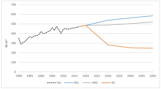 EU roundwood production (industrial roundwood + fuelwood) development in the reference (RSC), moderate (MSC) and intensive scenario (ISC) up to 2050 [authors’ results] as well as historical development data (His) [17].