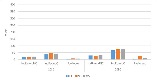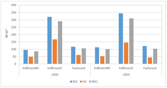 EU roundwood production by wood types in RSC (blue), ISC (orange) and MSC (grey). IndRoundNC and IndRoundC refers to non-coniferous and coniferous industrial roundwood, respectively [authors’ results].