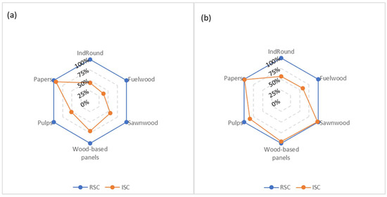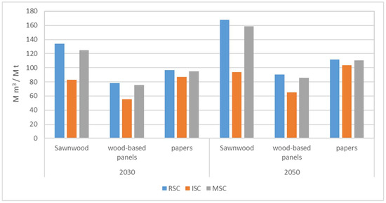 In the base year 2017, the simulated EU production of wood-based panels including veneer and plywood amounts to 61.3 M m3. In the RSC, it steadily increases up to 2050 (Table A7). In the ISC, the production volume significantly decreases and corresponds to 71% and 72% of the reference production in 2030 and 2050, respectively. In the MSC, EU production follows the trend of the RSC but is around 4% and 5% below the reference level in 2030 and 2050, respectively.