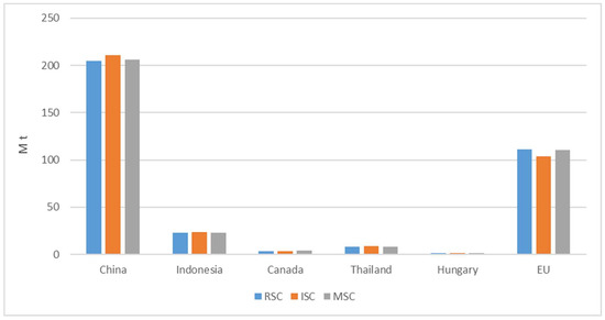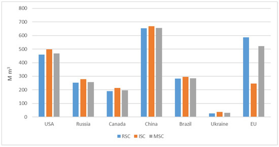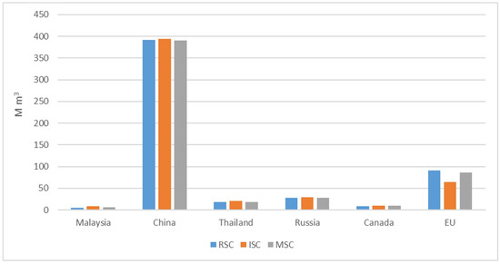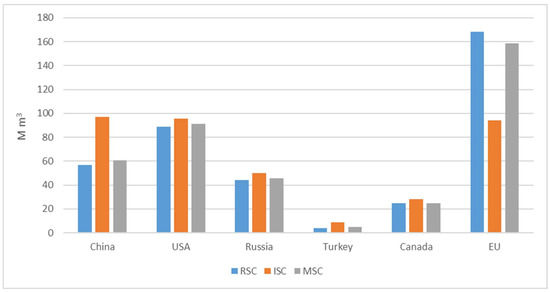 In the MSC, production outside the EU increases by 8.3 M m3 compared to the RSC in 2050. The countries with the highest share in additional production volumes are, again, China (46%), the USA (27%), Russia (16%), Turkey (9%) (Figure 6) and Brazil (9%), whereas other non-EU countries production significantly decreases (e.g., Malaysia –0.9 M m3, New Zealand –0.4 M m3). The global production volumes only differ marginally between the MSC and RSC.