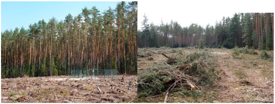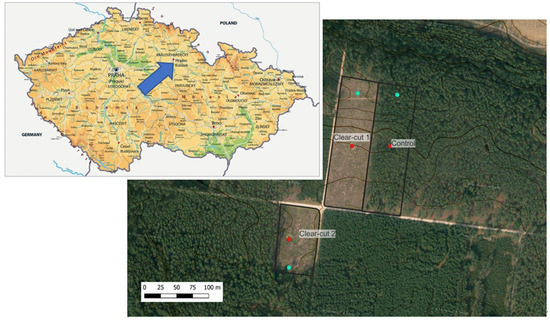 The experimental site was established in the municipal forests of Hradec Králové city in spring 2017 (50.18 N, 15.96 E). It was designed as three non-replicated research plots, comprising a forest stand left on site without any felling (Control) and two clear-cut stands (Clear-cut 1 and 2). The forest site is a “Scots pine with sessile oak on nutrient-poor soils” [19] at an altitude of 255 m (Figure 1). The age of the treatments ranged from 85 to 98 years; all stands were dominated by Scots pine, other tree species were Norway spruce growing mostly in lower-storey and also rarely Weymouth pine [19]. Scots pine forms from 91 to 93% of the stand basal area, which was 44, 42 and 42 m2 in Clear-cut 1, 2 and Control, respectively. The average height of Scots pine was from 27 to 28 m at the research plots [20]. The forest soils of the study site included unconsolidated fluvial sandy gravel sediments of a Pleistocene origin, below which Cretaceous sediments existed [21,22].