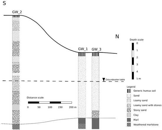 As was shown in our study, clear-cutting combined with felling residue removal and soil surface ploughing can mitigate acidification of the upper soil layer to some extent. It is likely affected by furrows’ surfaces, where the infiltrating water was minimally affected by the forest floor humus. As water penetrated the deeper soil, pH levels became comparable among all treatments. On the other hand, groundwater pH dropped below both clear-cut treatments compared to the control stand. The acidification rate seems to correspond with the size of the clear-cut. Considering the different methods of harvesting and soil preparation, as well as the ambiguous progress of the pH levels at L-10 and L-70, this hypothesis can be hardly proved. Similarly, whole-profile nitrates were affected by clear-cutting; on the other hand, the trend was not so obvious for TOC. In addition, both clear-cut wells differed as they showed different layers within the profile (Figure 2). As mentioned above, neighboring GW_3 and GW_1 were similar in their profiles and differed only in the immediate roof and underlying rock of a marl layer. The more distant GW_2 differed in alternating layers of fine-grain and middle-grain slightly loamy sand. From depths of 5.6–6.8 m, the sand contained more loam compared to the overlying and underlying layers around the GW_2 well. These variations could also explain the different filtering effects of the soil profiles (compare [44]). For example, water flow moves downwards quickly through gravely layers at deeper parts of an unsaturated zone [45].