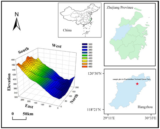 Wuchaoshan National Forest Park is part of Tianmu Mountain, located in Xianlin Town, Yuhang District, Hangzhou City, Zhejiang Province (33°41′ N, 120°00′ E), China. It is about 20 km away from Hangzhou City, with a total area of 522 ha, an average altitude of 264 m, and a maximum altitude of 494.7 m. As a natural forest ecosystem in the suburbs of Hangzhou City, Wuchaoshan National Forest Park is in the central subtropical zone, with an annual average temperature of 16.1 °C, an average temperature of the coldest month (January) of 3.6 °C, and an average temperature of the hottest month (August) of 38.4 °C. The mean annual sunshine hours are 1970.6 h, and the mean plant growth period is 311 days; red soil and yellow soil are the main soil types. The forest coverage rate of Wuchaoshan National Forest Park is as high as 93% with high plant species richness. Evergreen broad-leaved forest is the regional vegetation, and high-frequency trees include: Cyclobalanopsis glauca, Castanopsis chinensis, Schima superba, and Castanopsis sclerophylla. Before the 1970s, the entire reserve experienced regular human interference, such as felling, but the forest has been completely closed to afforestation for 40 years [17].