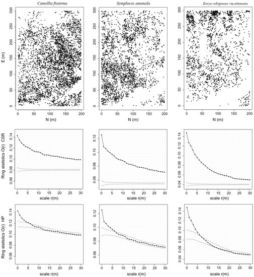 Spatial distribution scatter diagram and univariate point pattern analyses of Camellia fraterna, Symplocos anomala, and Eurya rubiginosa var. attenuata.