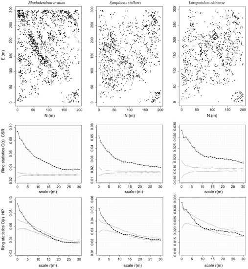 Spatial distribution scatter diagram and univariate point pattern analyses of Rhododendron ovatum, Symplocos stellaris, and Loropetalum chinense.
