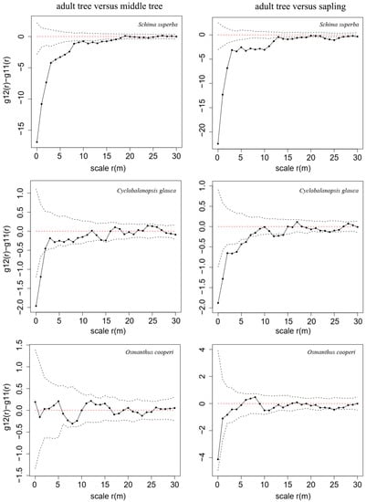 We used the univariate point pattern analysis function derived from Ripley’s K function [9,12,18] to study species’ spatial distributions. The principle of Ripley’s function is to count the number of plant individuals in a circle centred in a sample plot with radius r. Based on K(r), the double correlation function g(r) further considers the cumulative effects of small-scale patterns on large-scale patterns. Using rings instead of circles can more sensitively distinguish the deviation from the expected value of the actual distribution of points at a certain scale, and further improves the accuracy of univariate point pattern analyses [15]. The O(r) function [19,20] was introduced as the expected value of g(r):