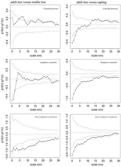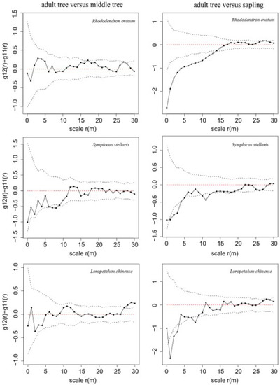Comparisons between saplings and adults of Camellia fraterna revealed greater sapling aggregation at 0–3.5 m scales, greater uniformity on some intermediate scales, but generally, randomness at most scales. In Symplocos anomala, saplings were more aggregated than adults on most scales, and only randomly distributed at the 20 m scale. Similarly, Eurya rubiginosa var. attenuate saplings were more aggregated than adults at 0–25 m scales but otherwise random. Rhododendron ovatum saplings were more aggregated than adults at 0–14 m scales and randomly distributed at other scales. Saplings of Symplocos stellaris were also more aggregated than adults at 0.9–5 m and 9.9–12.9 m scales, but more uniform at other scales. Saplings of Loropetalum chinense showed greater aggregation than adults at 0.5–3.4 m and 7–8.9 m scales, and random distributions at other scales (Figure 7).