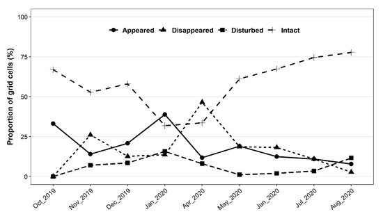 The temporal dynamics of rooting occurrence were described by the within-grid cell changes of wild boar disturbances noted between consecutive monthly assessments. These cells were categorized according to rooting intensity classifications, such as: (1) “Appeared”, if we found rooted soil surface within a grid cell, but there was no rooting there in the previous month; (2) “Disturbed”, if rooting was already found in the previous month in the cell and the area had been visibly disturbed again since then; (3) “Disappeared”, if no rooting was found in the grid cell, but it was rooted in the previous month; and (4) “Intact” if no rooting was observed during the survey or during the previous survey. The proportion of grid map cells within which rooting occurrence was observed were determined for each month.