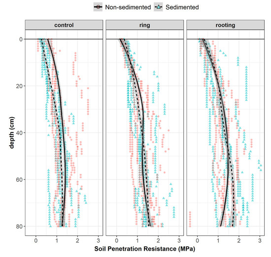 Soil penetration resistance in rooting, ring, and control areas in sedimented and non-sedimented soils. Dots represent observations from non-sedimented soils, while triangles from sedimented soils.
