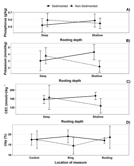 All parameters directly related to soil organic content, namely TOC, CEC and Nitrogen, were significantly negative. The pH was positively affected by sedimentation, and the roles of rooting-related factors were non-significant (Table 5). Potassium and Phosphorus levels were both higher in shallow-rooted sedimented soils just as in CEC (Table 5). The opposite was revealed for deep rooting on non-sedimented soil, called a crossover interaction (Figure 5). The clay content was highly varied according to sedimentation and location of sample collection at the rooted patch area (Figure 5D). The rooting depth (shallow or deep) can significantly influence Phosphorus, Potassium and CEC levels depending on the sedimentation, whereas the rooting itself might facilitate clay accumulation on the surface by redistributing sedimented soil.
