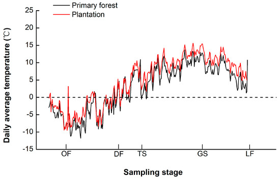 The temperature of litterbag was measured using DS1923-F5 Recorders (iButton DS1923-F5, Maxim/Dallas Semiconductor, Sunnyvale, CA, USA) every 2 h at each site and used to calculate the daily average (DAT) and total accumulated temperature (TAT, the accumulation of daily average temperature in the litterbag during each stage) during the whole experimental periods. The average daily temperature in the alpine forests was showed in Figure 1. The trend of the daily average temperature of the primary forest and the plantation forest is basically the same, but from the growing season to the leaf falling stage period, the daily average temperature of the plantation forest is higher than that of the primary forest. The water content of litter was dried into oven for 48 h until its weight was constant, then it was recorded.