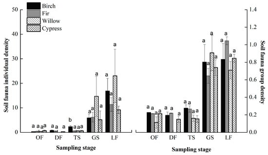 Individual and group density of soil fauna in different sampling stage (mean ± standard error, n = 3). OF: onset of freezing, DF: deep freezing stage, TS: thawing stage, GS: growing season, LF: leaf falling stage. The letters a and b mean in the sampling stage with different letters differ significantly, p < 0.05.