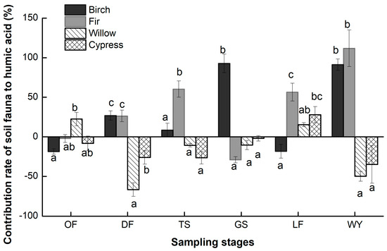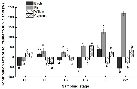 The contribution rate of soil fauna to the accumulation of fulvic acid showed the order as, fir (220.24%) > cypress (35.43%) > willow (−28.24%) > birch (−55.64%). Soil fauna promoted the accumulation of fulvic acid in the litter of willow and cypress but limited the accumulations of fulvic acid in other two litters at OF stage (Figure 6), which showed the opposite side at OF stage. Soil fauna promoted the accumulation of fulvic acid in the litter of fir and willow and inhibited the accumulation in the litter of birch and cypress at TS stage. At the stage of GS, soil fauna promoted the accumulation of fulvic acid in the litters of fir and cypress but inhibited the accumulation in the litters of birch and willow. Soil fauna only inhibited the accumulation of fulvic acid in willow litter at LF stage, whereas soil fauna contributed 40.42% and 128.10% increase of fulvic acid in the litters of birch and fir, respectively.