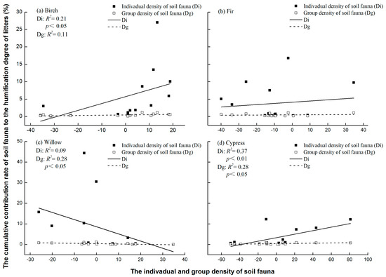 The linear regressions show the correlation of individual and group density of soil fauna with cumulative contribution rate of soil fauna to the litter humification degree differed among species (Figure 8). Soil fauna significantly influenced the humification degree of the litter of birch, willow, and cypress, while it had no significant effect for fir litter. There was a significant correlation of individual density of soil fauna with humification degree for the litter of birch (p < 0.05, R2 = 0.27, Figure 8a) and cypress (p < 0.01, R2 = 0.37, Figure 8d). Additionally, there were significant correlations of group density for the litter of willow (p < 0.05, R2 = 0.28, Figure 8c) and cypress (p < 0.05, R2 = 0.28, Figure 7d).