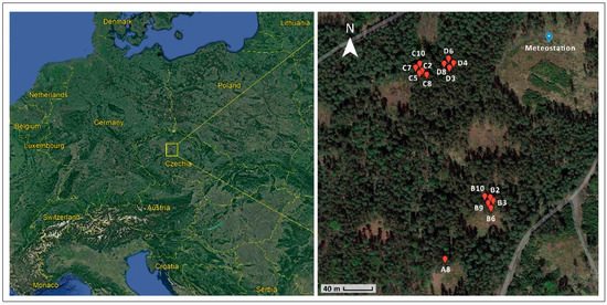 The study was carried out in a forest on the property of the Czech University of Life Sciences Forest Enterprise, near Stříbrná Skalice town (09′48″—41°10′55″ N, 28°57′27″—28°59′27″ E, Figure 1). Four plots were created to compare the sap flow of the sample trees from the forest edge after clearcutting and forest interior without any effect. Two plots (named A and B) were chosen as treatment plots, while the other two plots (C and D) remained untreated. We chose the parts of the forest stand in a similar density, without gaps. The specific trees were selected regarding their health status, lacking defoliation, wounds on the stem, or any other damage markers (Table 1). The experimental plots were situated at an altitude of 430 m above sea level. The mineral bedrock was granodiorite (so-called Říčanská žula) covered by Luvisol, with a transition to Pseudogley in some parts. Soils had good nutrition levels and sufficient buffering capacity. The production conditions for forest trees can be evaluated as good or very good. Both experimental sites are situated on a plane or slight slope in an oak–beech zone. The prevailing edaphic category on both sites is the nutrient medium transitional category without significant soil-water influence. The dominant tree species is a 95-year-old spruce, with an admixture of pine, larch, and oak. The average annual temperature is 7–7.5 °C, the average annual sum of precipitation ranges from 600 to 650 mm, and the vegetation-season duration is 150–160 days [30].
