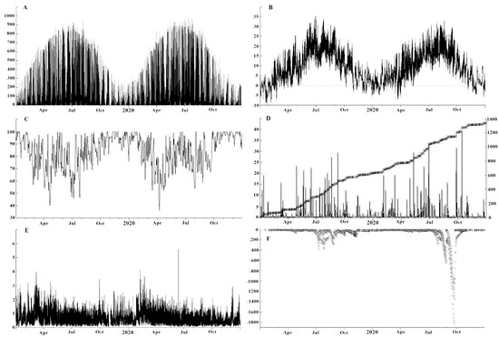 Temporal pattern in meteorological parameters during the study period at the study site. (A): global radiation (W·m−2), (B): air temperature (°C), (C): relative humidity (%), (D): precipitation and cumulative precipitation (mm), (E): wind speed (m s−1), (F): soil-water potential (kPa) of the study plots (x: plot A, ○: plot B, □: plot C, ∆: plot D).