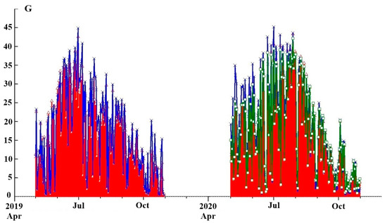The diurnal mean sap-flow pattern of the study plots. G: sap flow (kg day−1). ∆ with red color: the measured sap flow of Cp. X with blue color: the measured sap flow of Tp. □ with green color: the predicted values of Tp.