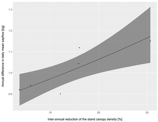 Relationship between stand-canopy density and sap-flow difference on the forest edge with the 95% confidence interval. X-axis reduction in canopy density between 2019 and 2020 on 10-meter buffer around the tree, Y-axis change in sap flow measured df = 4; R2 = 0.69; p < 0.05).