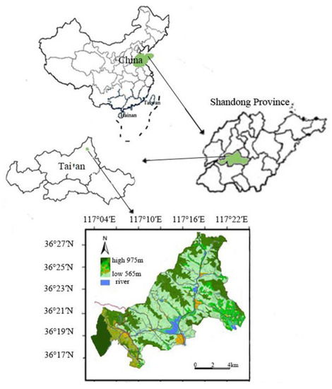 The study area is located in Mount Tai Forest Ecosystem National Positioning Observation and Research Station (E117°04′–117°22′, N36°16′–36°28′) in the Huangqian watershed of Tai’an City, Shandong Province. It is located in the northwest of the Taiyi Mountain Area of Shandong province in the earthy-rocky mountain area of northern China, with a total area of 292.20 km2 (Figure 1). The soil type is Haplic Luvisol formed by granite gneiss (World Reference Base for Soil Resources, WRB). The soil layer is relatively thin, with an average thickness of 30–40 cm, mostly slightly acidic, and the pH value is 5.5–6.5. It is a warm temperate continental semi–humid monsoon climate. Moreover, the average annual rainfall is 758 mm, and 75% of the precipitation is concentrated between June and September. The study area is a national key ecological protection forest area with a forest coverage rate of 89%. The vegetation type is the warm temperate deciduous broad-leaved forest, mainly including Quercus acutissima Carruth., Robinia pseudoacacia L., Pinus densiflora Sieb. Et Zucc., and Larix kaempferi (Lamb.) Carr.