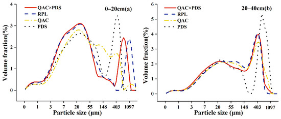 Soil particle composition of four vegetation restoration types. QAC × PDS is the mixed forest of Quercus acutissima–Pinus densiflora, RPL is the Robinia pseudoacacia forest, QAC is the Quercus acutissima forest, PDS is the Pinus densiflora forest. (a) represents the frequency curves of soil particles of 0–20 cm soil layer, (b) represents the frequency curves of soil particles of 20–40 cm soil layer.