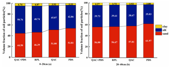 As can be seen from Figure 3, there were significant differences (p < 0.05) in the soil particle content distribution between the different vegetation restoration types. Soil clay and silt content followed a consistent pattern, i.e., QAC × PDS > RPL > QAC > PDS. Sand content dominated the four vegetation-restoration-type soils, ranging from 44.50% to 61.97%. The clay content ranged from 3.00% to 4.87% and the silt content ranged from 35.03% to 50.76%. The QAC × PDS had the highest content of silt, which was 1.16 times higher than the silt content of PDS.