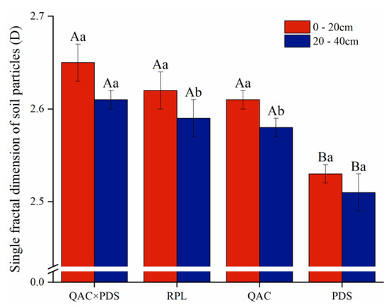 The present study found significant differences in D values of four vegetation restoration types (p < 0.05). The order of D values was QAC × PDS > RPL > QAC > PDS (Figure 4). It showed that QAC × PDS has the smallest soil particle size and the finest grain texture among the four vegetation types, and it was easy to form a soil structure with a good water and fertilizer retention effect. RPL and QAC were next, and PDS was the worst. From the perspective of the vertical section, the D value of the 0–20 cm soil layer is greater than that of the 20–40 cm soil layer. It showed that in the 20–40 cm soil layer, the soil particles are coarse, the texture is poor, the soil structure is loose, and it is easy to lose water and fertilizer, which is not conducive to vegetation growth. Due to the accumulation of litter under the forest and the soil and fertilizer conservation effect of vegetation roots, the soil layer of 0–20 cm can increase the soil aggregate structure and form more fine-grained materials, resulting in a large D value. However, after the natural process of evolution, the soil structure of the 20–40 cm soil layer was gradually compacted, the coarse-grained materials in the soil increased, and the D value decreased.