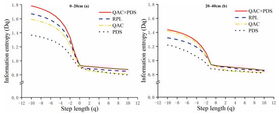 Using Formulas (2) and (3), the multifractal dimensions of soil particles in the range of −10 ≤ q ≤ 10 are calculated, and the generalized dimensional (Rényi) spectrum D(q) − q is drawn in steps of 1. D(q) is the singularity index of the soil PSD, and q is the real number. The Rényi spectrum is a classical tool to characterize complex distributions that are closely related to the multifractal singularity spectrum but have an easier handling and interpretation [32].